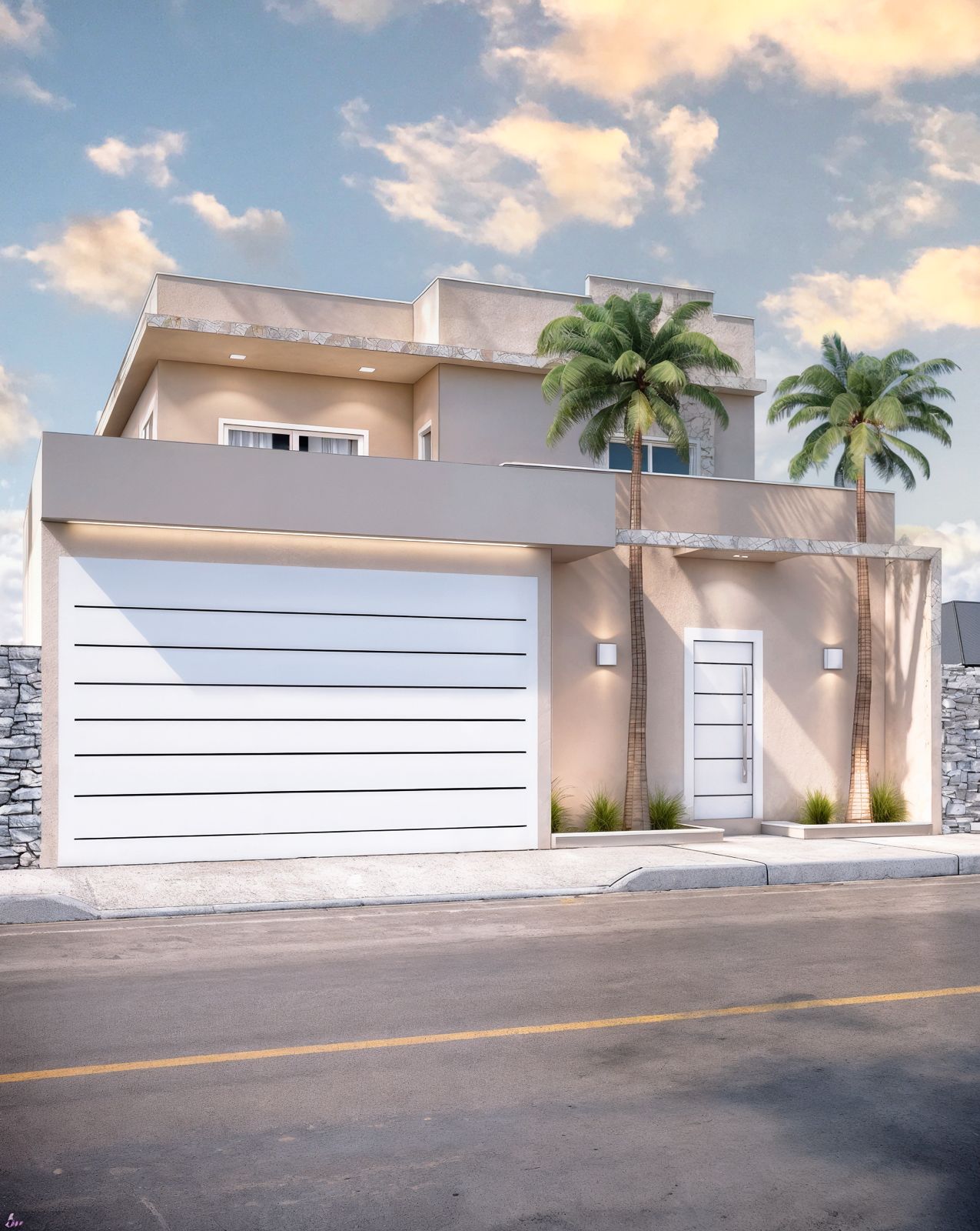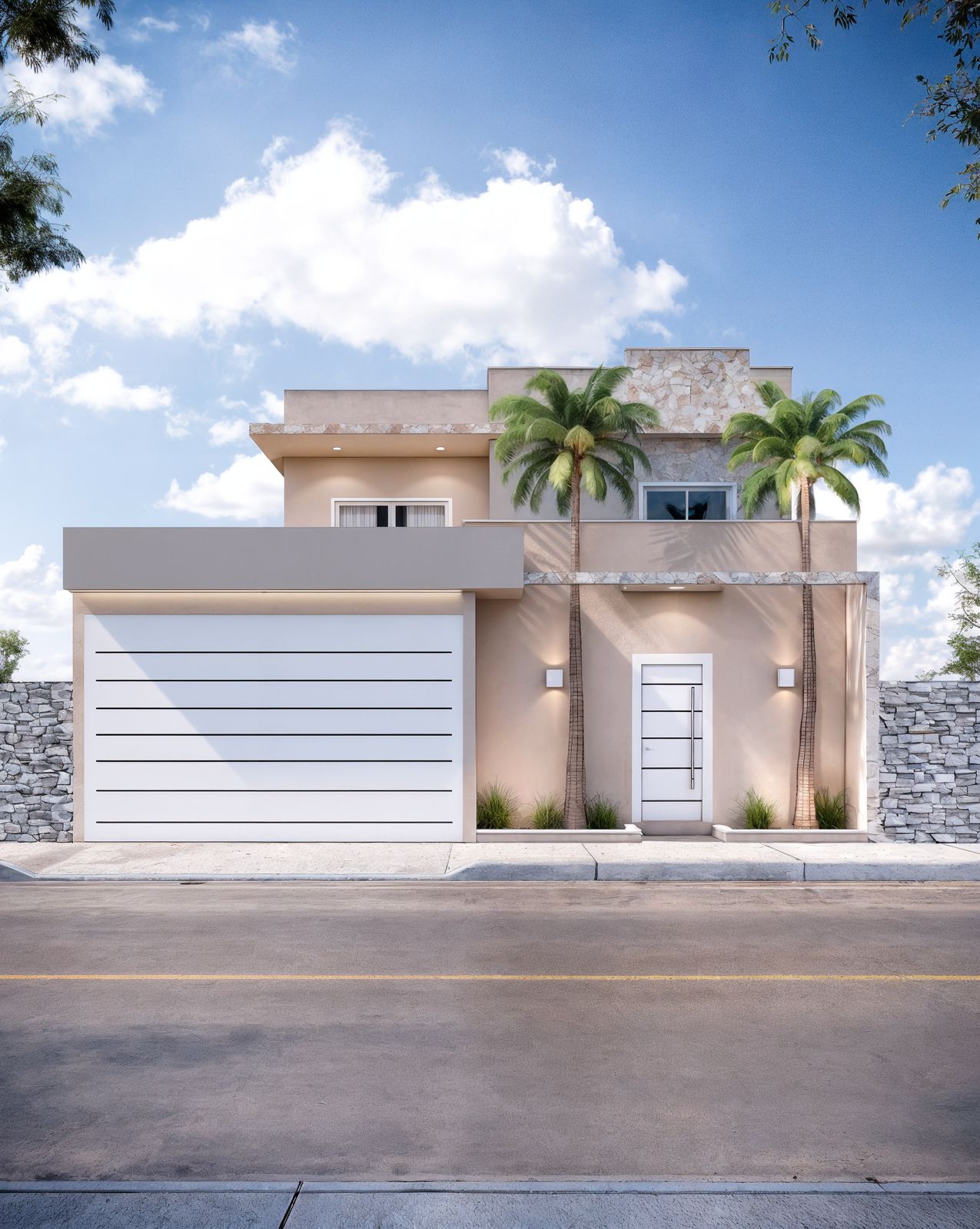 O uso de revestimentos em pedra natural traz textura e sofisticação ao visual, criando pontos de destaque que conduzem o olhar e reforçam a identidade do projeto. O muro frontal, aliado ao portão de design minimalista, cria uma leitura visual contínua e imponente, enquanto a porta principal em destaque vertical complementa a proposta moderna e acolhedora.