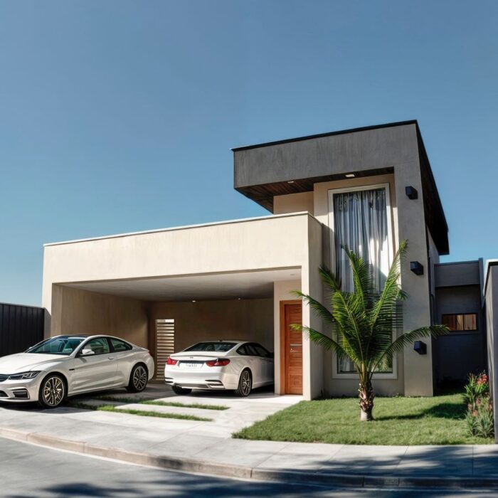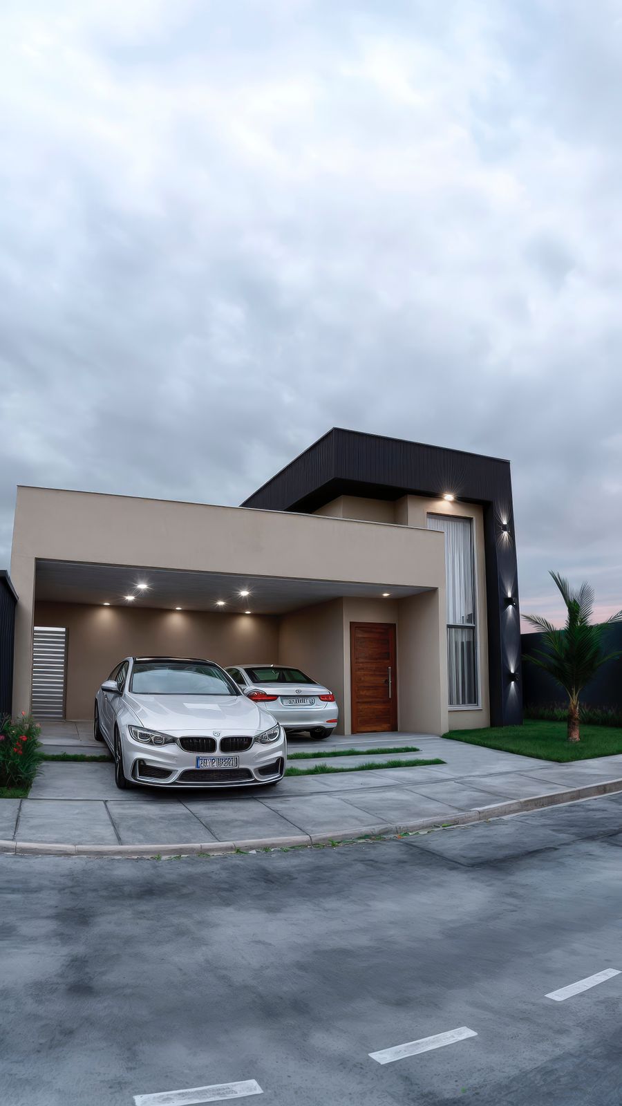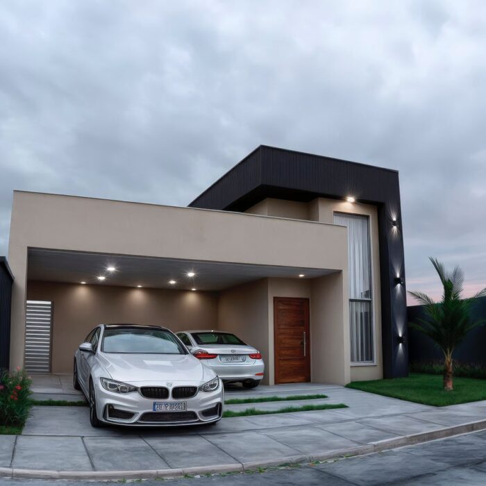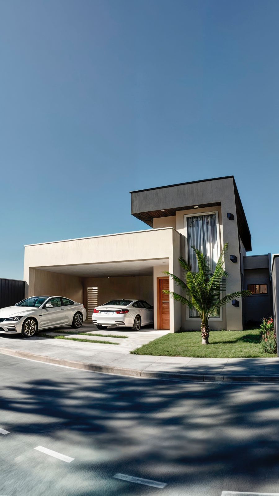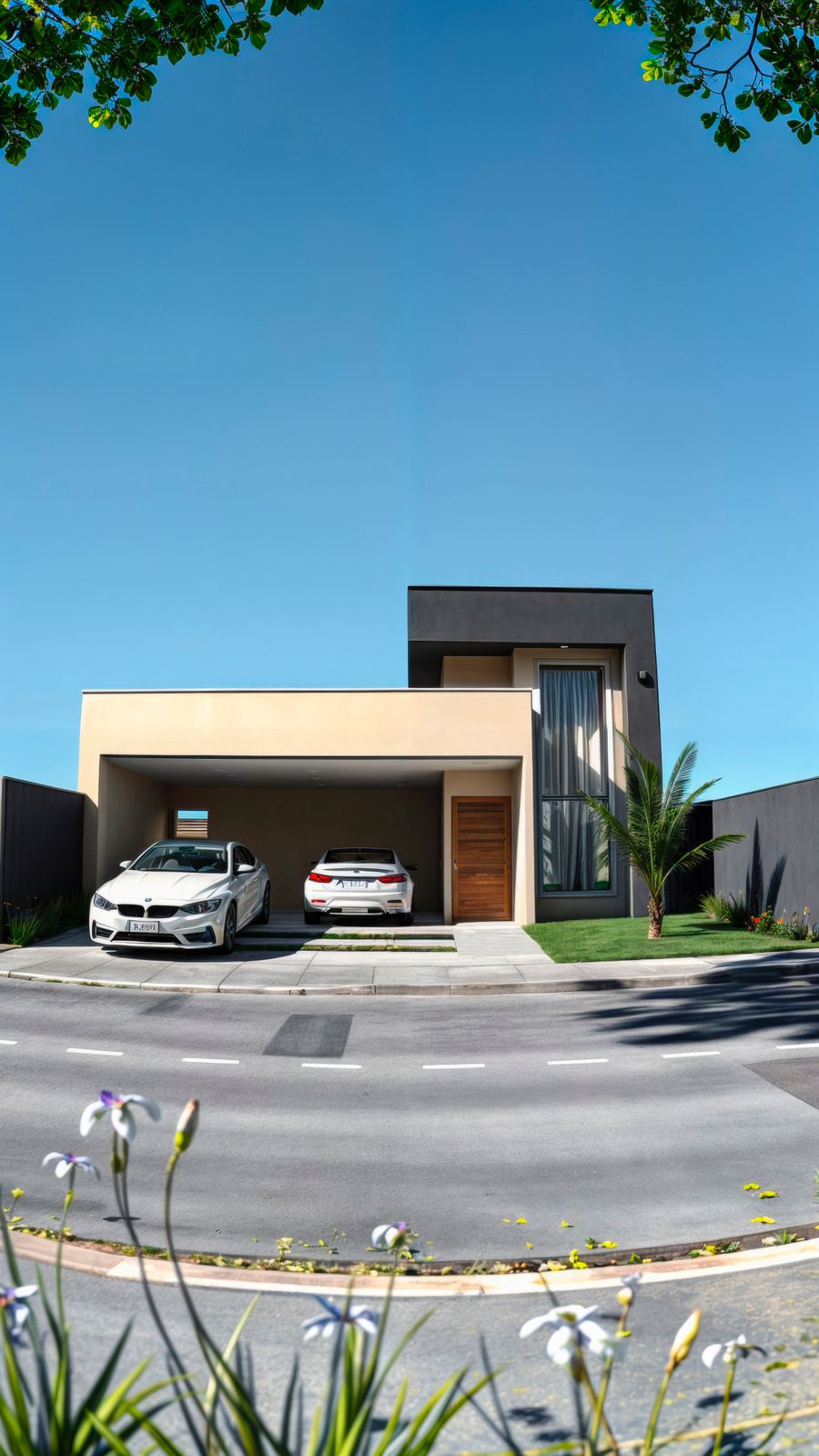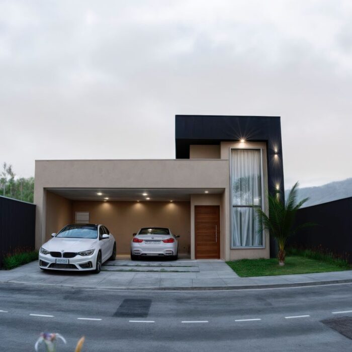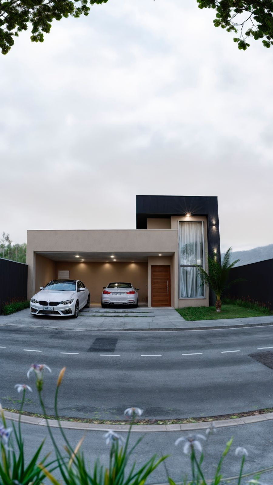 Este projeto evidencia a essência da arquitetura moderna: volumes bem definidos, paleta de cores neutras e integração visual entre elementos estruturais. A composição da fachada é marcada pela combinação de texturas — destaque para o contraste entre o tom areia claro e o bloco superior em cinza grafite. A porta em madeira ripada, junto à esquadria vertical de vidro, valoriza a entrada principal com sofisticação e imponência.